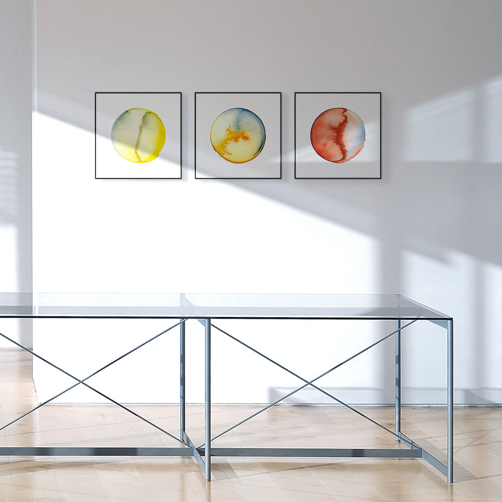 Display your museum quality print individually - or in multiples where colors appear to flow between the prints, their circular form forever on the point of movement.