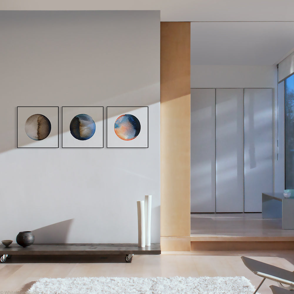 Display your museum quality print individually - or in multiples where colors appear to flow between the prints, their circular form forever on the point of movement.