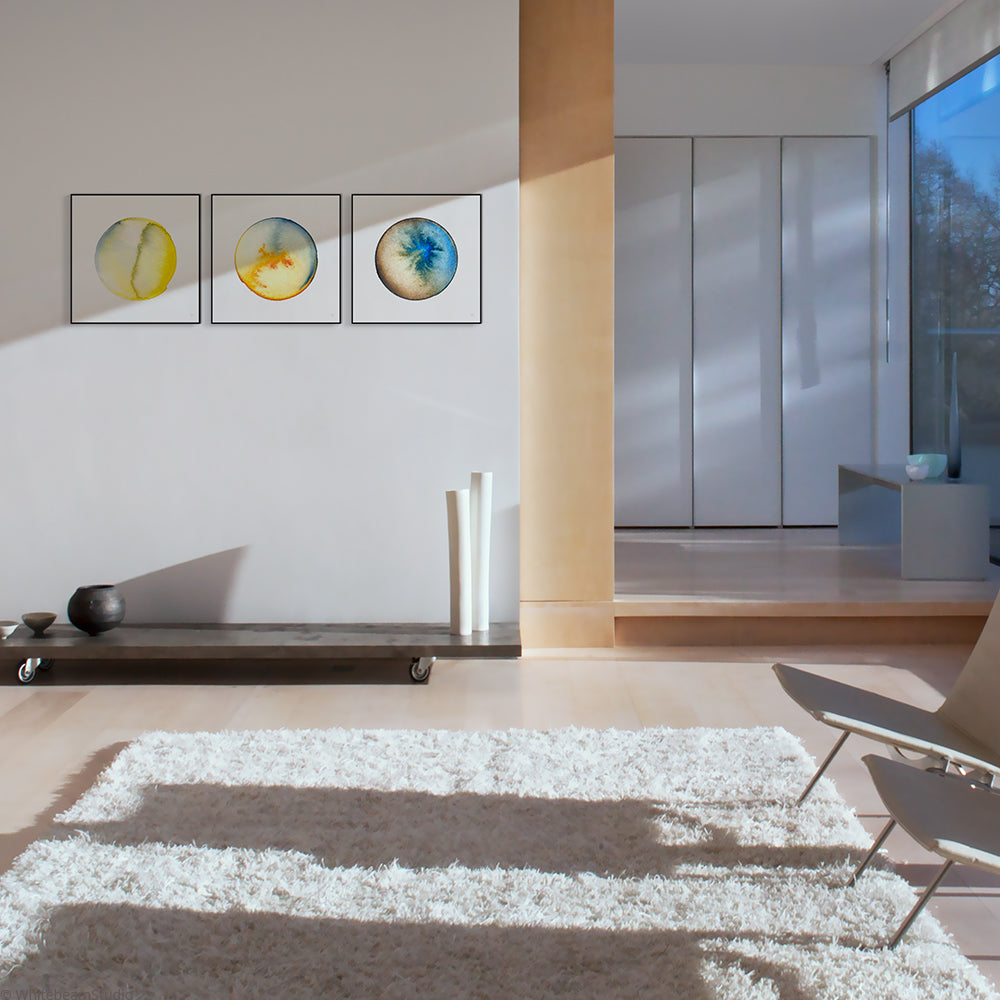 Display your museum quality print individually - or in multiples where colors appear to flow between the prints, their circular form forever on the point of movement.