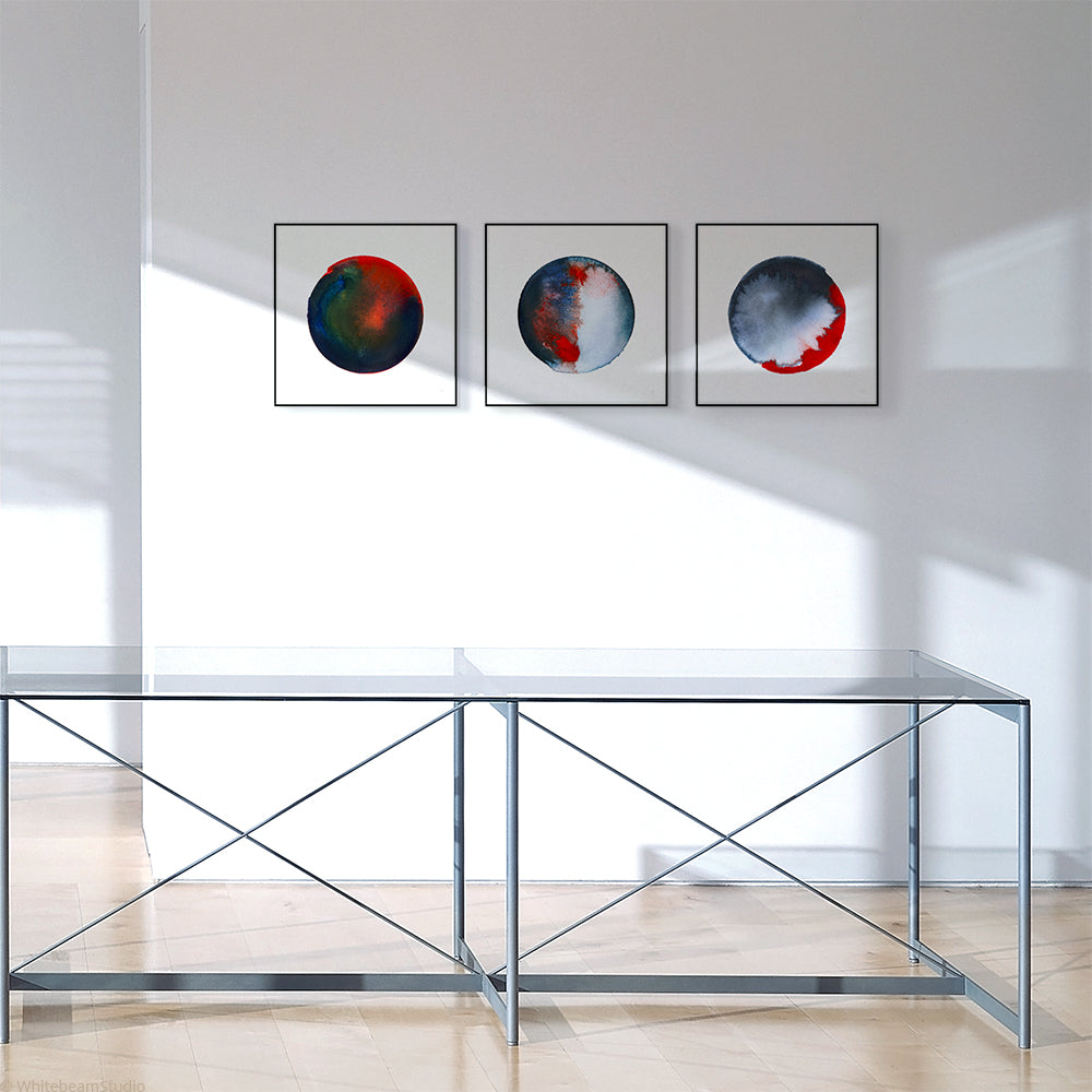 A curated set of three limited edition prints. Displayed in a sequence, colors appear to flow between the prints, their circular form forever on the point of movement.