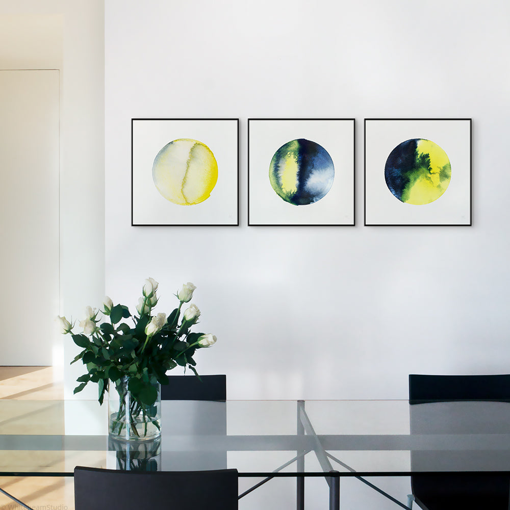 A curated set of three limited edition prints. Displayed in a sequence, colors appear to flow between the prints, their circular form forever on the point of movement.
