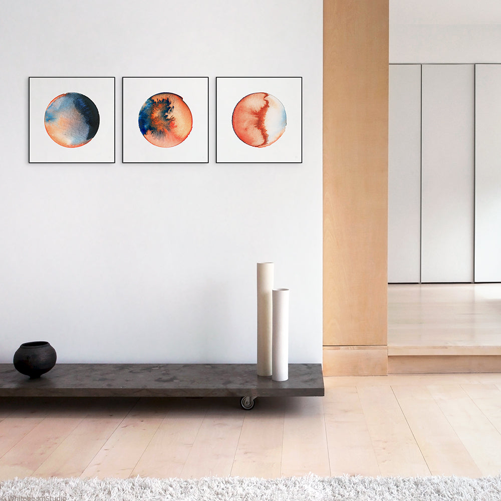 A curated set of three limited edition prints. Displayed in a sequence, colors appear to flow between the prints, their circular form forever on the point of movement.