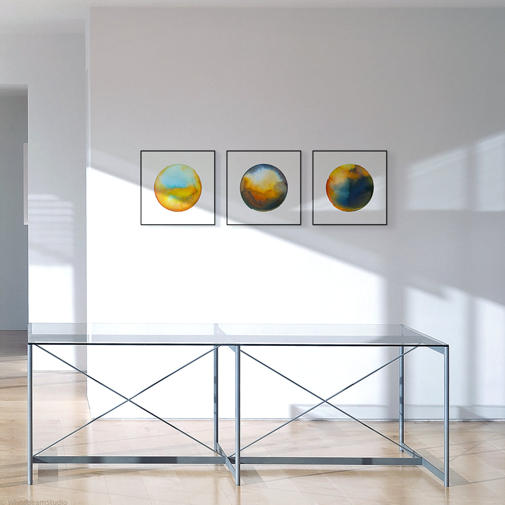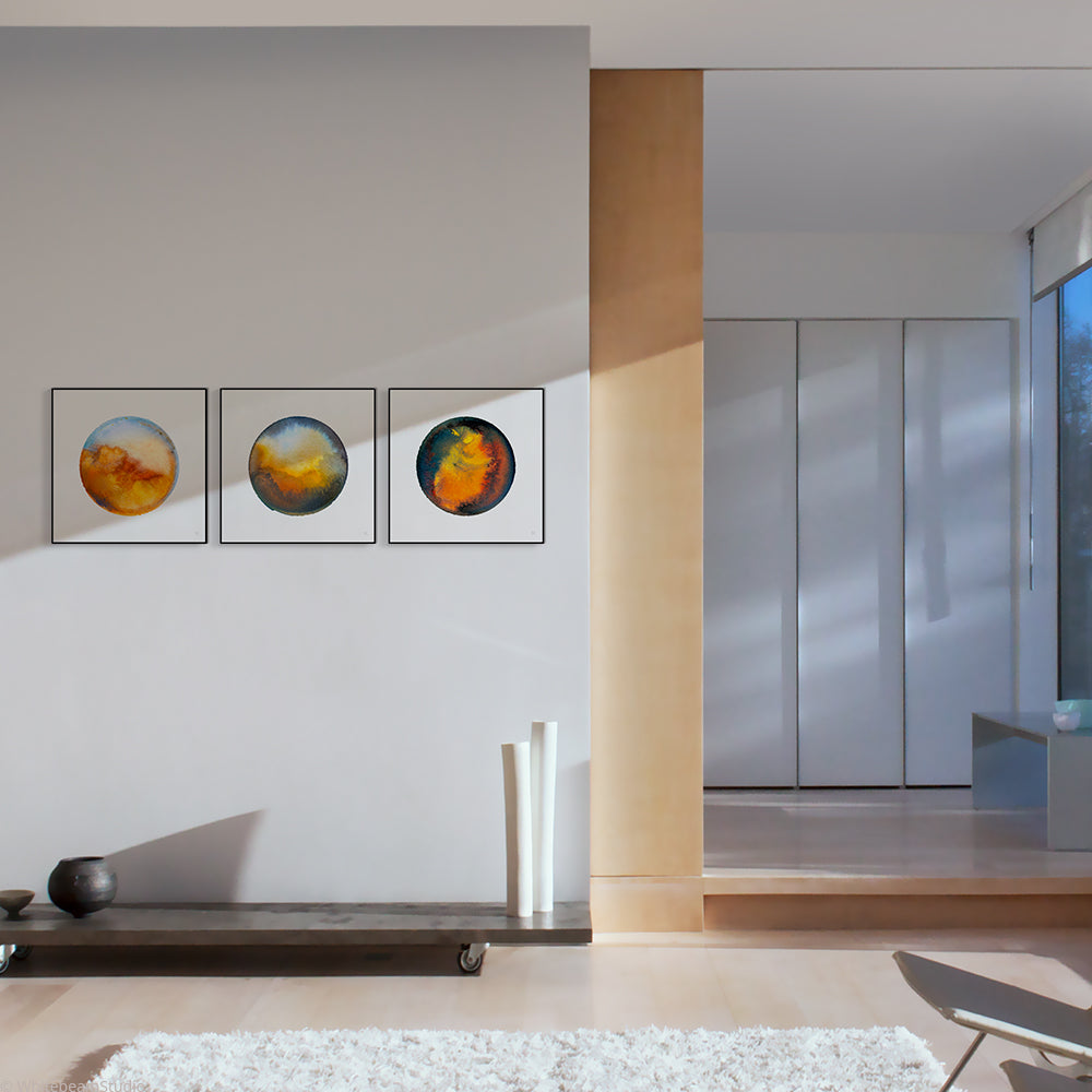 A curated set of three limited edition prints. Displayed in a sequence, colors appear to flow between the prints, their circular form forever on the point of movement.